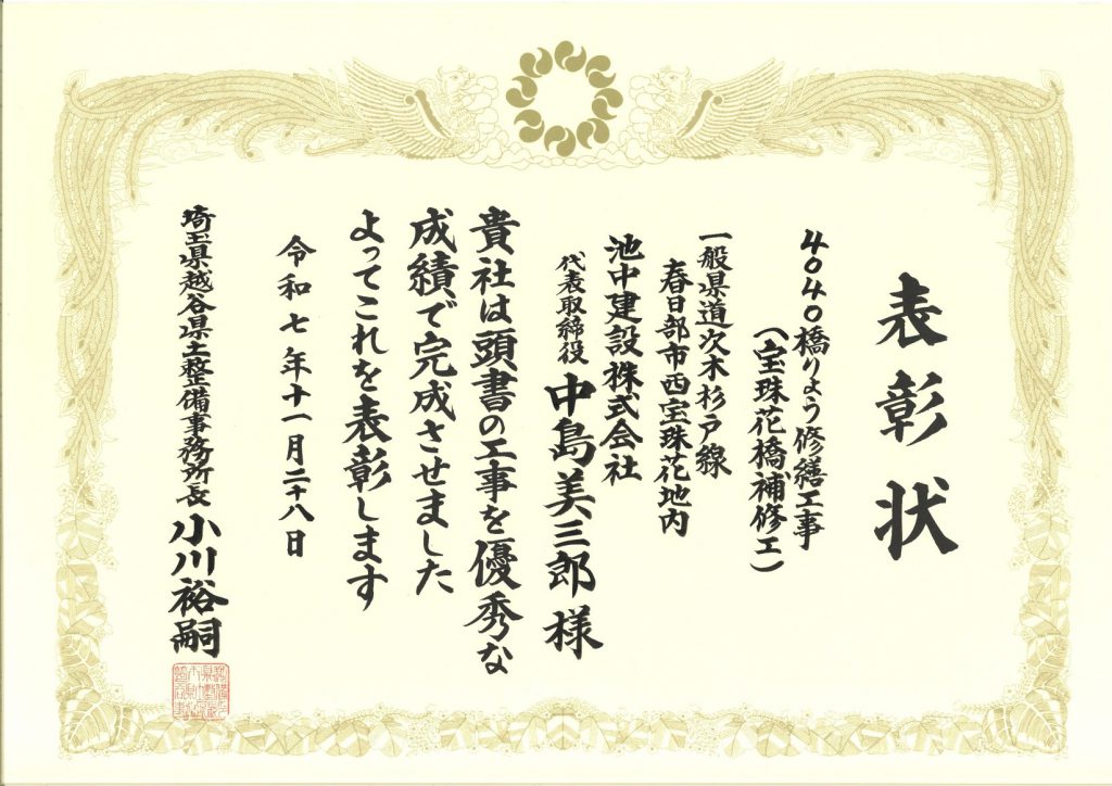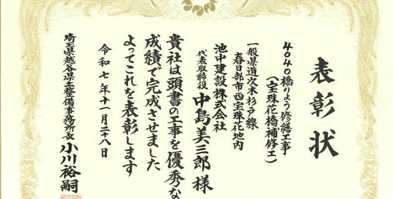 【令和7年11月 越谷県土整備事務所より施工者表彰を受賞しました。】 2026年4月8日 Author: wpmaster Category: お知らせ 令和7年11月28日 令和7年度埼玉県越谷県土整備事務所で表彰が行われました。 【工事名 4040橋りょう修繕工事(宝珠花橋補修工)】